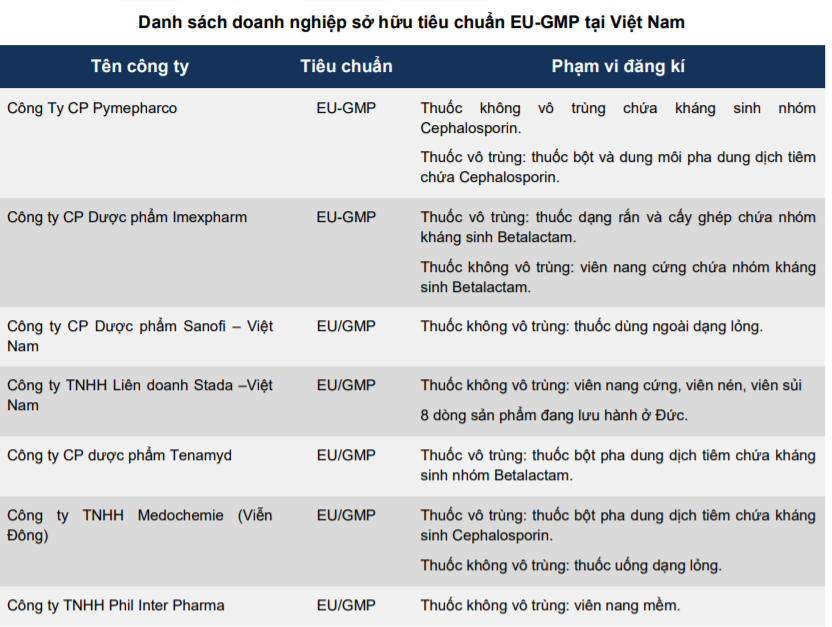 Hiện tại ở Việt Nam chưa có nhiều doanh nghiệp nội địa sở hữu tiêu chuẩn nhà máy EU-GMP (chỉ có 7 doanh nghiệp như: IMP, PME, Stada,…).